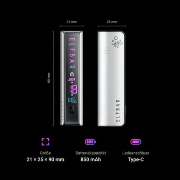 Der ElfBar ELFA Master Akkuträger ist ein wiederaufladbares Pod System aus der ELFA Reihe und zeichnet sich durch eine kompakte und ergonomische Bauweise sowie dem leichten Gewicht von 60g aus. Trotz der kompakten Bauweise (90mm Höhe x 25mm Breite x 21mm Tiefe) verfügt das ELFA Master Basisgerät über eine Akkukapazität von 850mAh und eine Ausgangsleitung von bis zu 18 Watt. Ausgestattet mit der Fast-Charging-Funktion lässt sich der Akku schnell über USB-C aufladen. Die ElfBar ELFA Master ist zudem mit allen ELFA LeerPods und ELFA Prefilled Pods kompatibel.